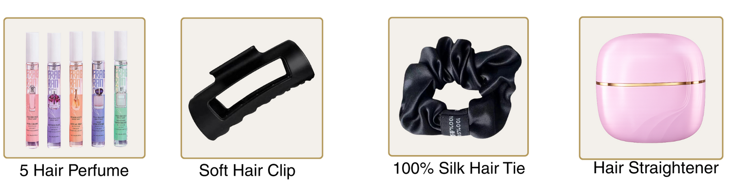 You get the full 5-in-1 kit: the SmoothStyler™ device, hair perfume roll-ons, a styling clip, a silk hair tie, and priority tracked shipping.